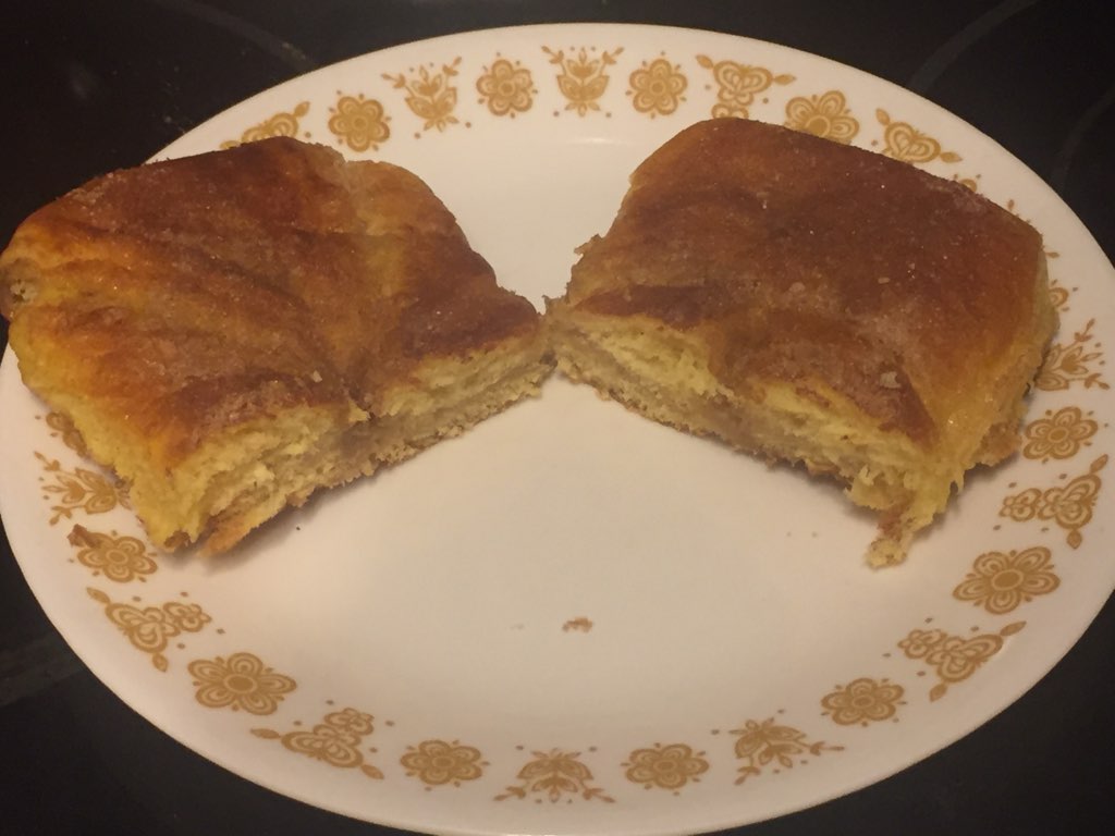 The first treat that I ate was a chocolate croissant twist. This was a nice snack. The bread was a little flaky, but really soft. There was a custardy mixture in there along with the chocolate chips. Eating this put a smile on my face.