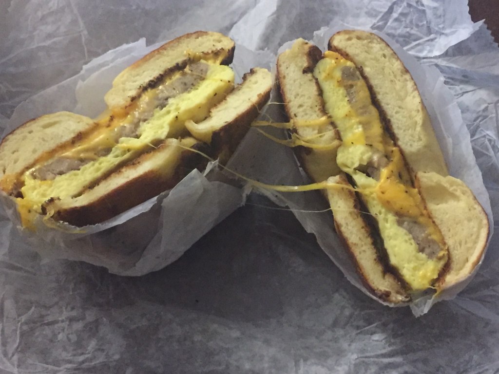 I decided to do something a little different for breakfast this morning. When I’ve gotten food from Kismet Cafe before, I would only get a toasted bagel with cream cheese. I ordered a sunrise sandwich with egg, sausage, and cheddar cheese on a Challah bagel. I really like the Challah bagel, and the texture was perfect for this sandwich. The sausage had a really nice flavor. The eggs had great consistency. Not too hard and not too fluffy. The melted cheese gave it the extra little oomph. A great start to the morning, and a breakfast sandwich I will order again.