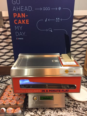 I stayed in a Holiday Inn Express. They had an automatic pancake maker, which I had to try. The pancakes were good. You can’t see them being made. You push a button, wait about a minute, and then see them coming out and onto the plate.